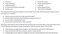 Fixed wording of questions asked left so that both players would record the question on their respective sheets. Expanded the prompts table to 52 prompts to be able to use a standard deck of cards as...
